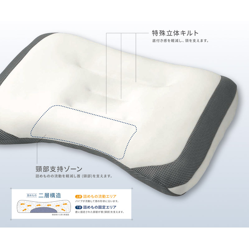 整形外科医推奨の自分好みに高さ調整ができるnishikawaおすすめのまくらシリーズです。立体形状・立体キルトで首(頸部)・頭を支えるまくら。まくら全体が2つの部屋に分かれており、立体キルト設計で仰向き時の中材の流動を抑え、首(頸部)を支えます。