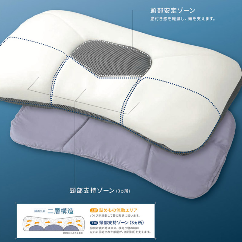 整形外科医推奨の自分好みに高さ調整ができるnishikawaおすすめのまくらシリーズです。立体形状・立体キルトで首(頸部)・頭を支えるまくら。まくら全体が5つの部屋に分かれており、頸部二層立体キルト構造で仰向き・横向き寝時の中材の流動を軽減し、首(頸部)を支えます。二層の高さ調節シートで細かな調整が行えます。