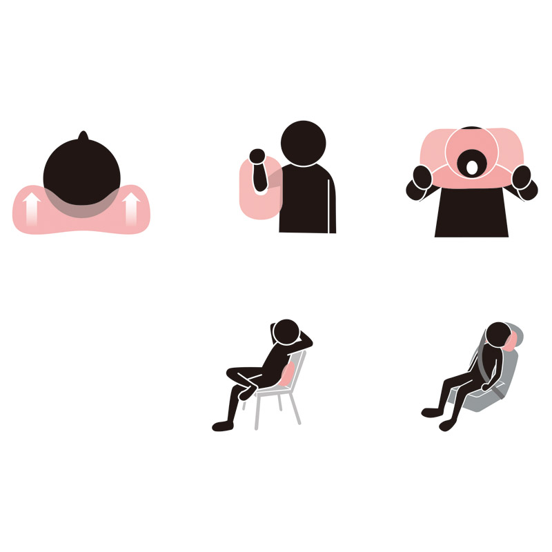 まくらに穴を空けることで、中央に向かってゆるやかな傾斜ができ、頭や腰、おしりなどに沿ってフィットします。テレビのごろ寝見やオフィスの机上でのお昼寝などに便利です。