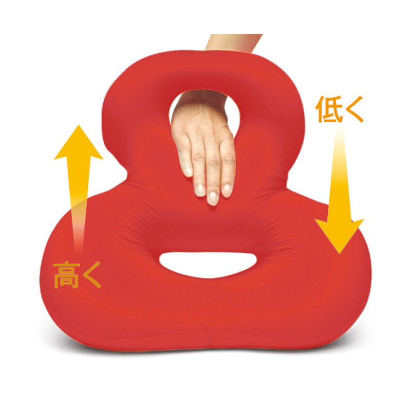 8の字型が可愛く機能的なバックサポーター。2つ穴が3段階のボリュームを作り出し、パウダービーズの流動性によっておしり・腰・背中を支えます。