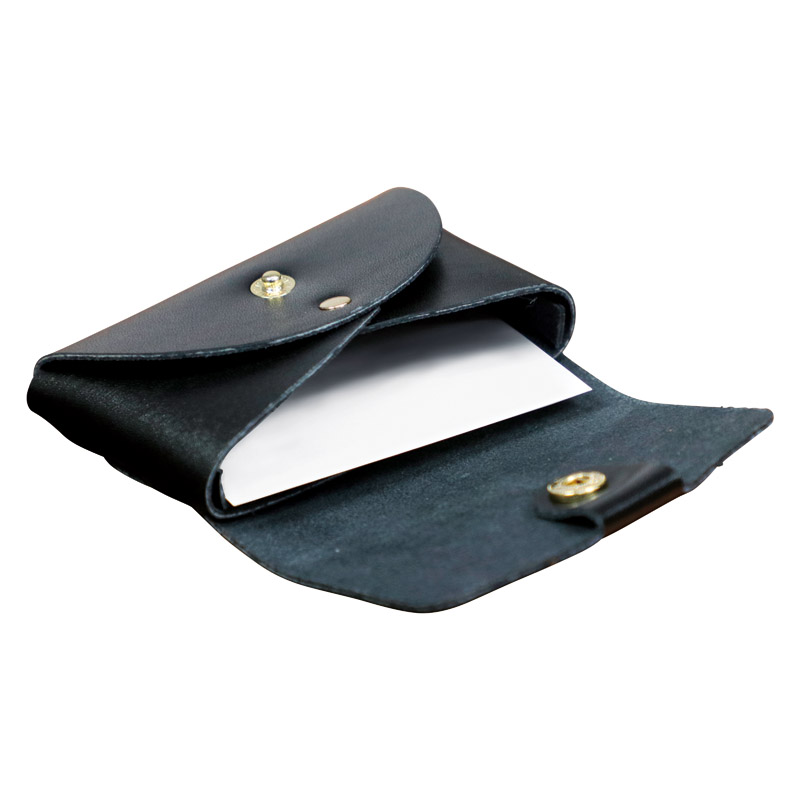 普段使いに便利な生活に溶け込む商品を目指し、一つひとつ丁寧に作っています。裁断した牛革を組み合わせることでミシンでの縫製を無くした耐久性に優れた名刺入。・かぶせホック開閉式・内名刺入れ×1・オープンポケット×1