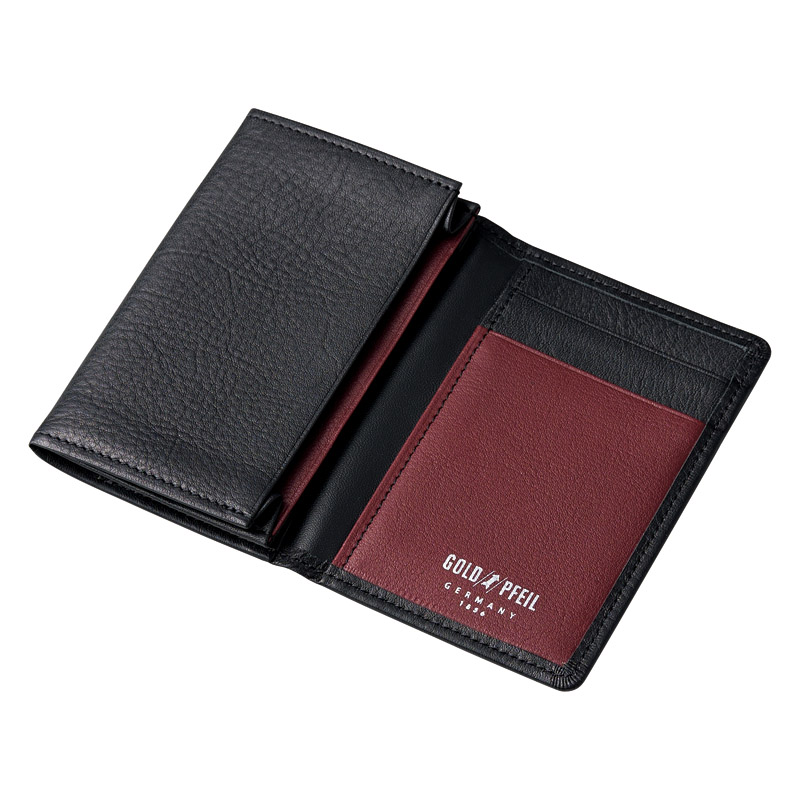 ナチュラルな牛革を使用し、ゴールドファイルのブランドカラーであるバーガンディとのコンビネーションの内づくりが特徴です。・名刺入×2・カード入×2