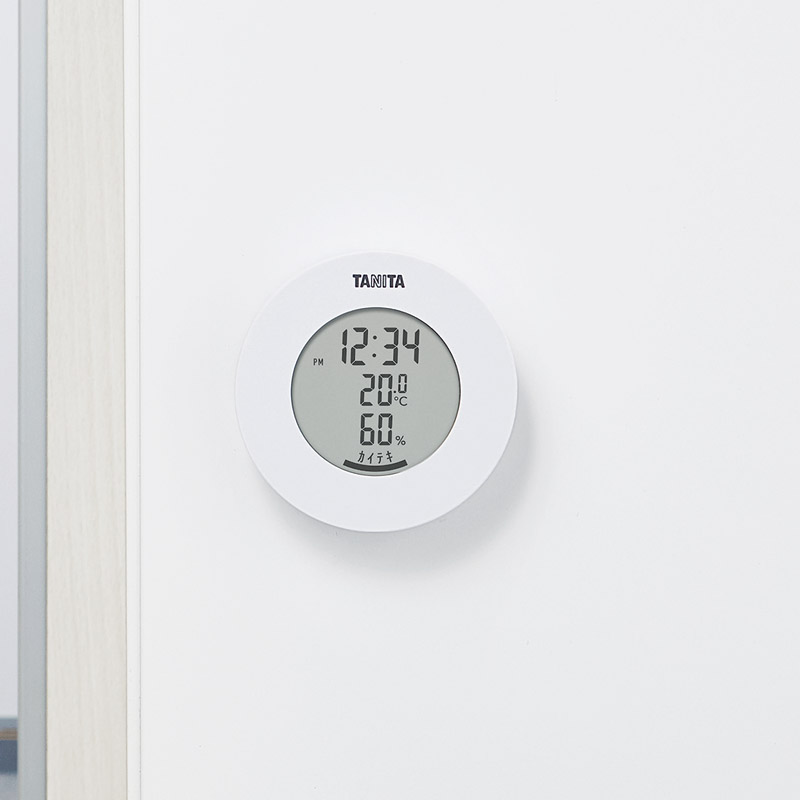 インテリアになじむデザイン。○3段階の快適度(カラカラ・カイテキ・ジメジメ)を表示○過去の最高・最低温湿度を表示○インテリアに馴染む丸型のデザイン○置き式では傾斜がつき、マグネット使用時は傾斜がなくなる使い勝手のよい形状○小型設計
