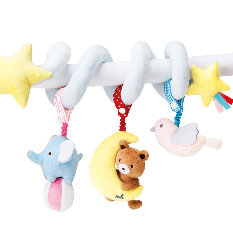 ベビーカーやベッドに取り付けることができるソフトプレイジムです。どうぶつたちは取り外して、ガラガラとして遊んでいただけます。