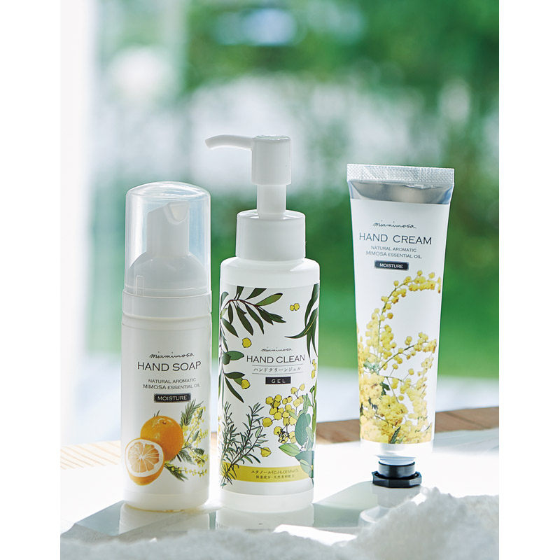 -天然香料がほのかに香るハンドケアシリーズ-【ハンドクリーム】天然香料ミモザ精油がふんわりと柔らかく香る、するすると伸びる滑らかな使い心地のハンドクリーム。ヘーゼルナッツオイルとアロエベラエキス配合でしっかり潤うのにべたつかず、やわらかな手肌へ導きます。【ハンドソープ】アミノ酸系洗浄成分を配合した、クリーミーな泡立ちのハンドソープです。保湿成分を配合し、繰り返し使って頂きやすい洗い上がり。洗うたびにふんわり広がる天然香料が、やすらぐひとときを演出。【ハンドクリーンジェル】手指を清潔に保つ洗浄成分エタノールを配合した、軽い使い心地のハンドクリーンジェル。爽やかで心落ち着くひとときへと誘う天然香料が使うたびほのかに香り、繰り返し使っても肌荒れしにくい保湿成分を配合しています。