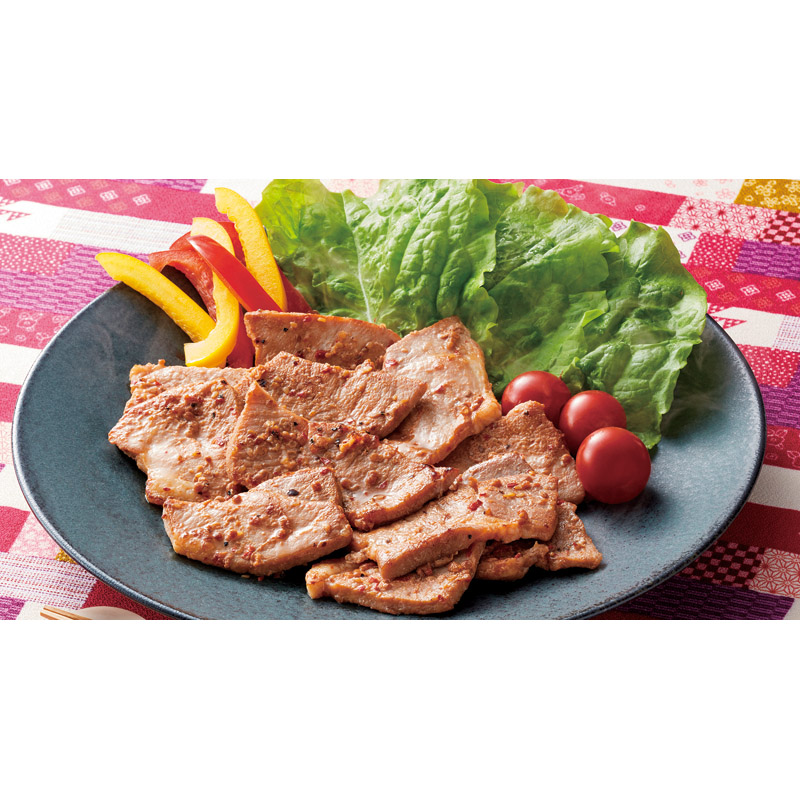 大地の恵みを味わう沖縄ブランド豚 沖縄県産の豚肉「あぐー」を食べやすいようにカットして、焼肉用のたれで味付けしました。肉の旨味が感じられる味わいです。レタスなどで包んで、薬味と一緒に食べるのがおすすめです。
