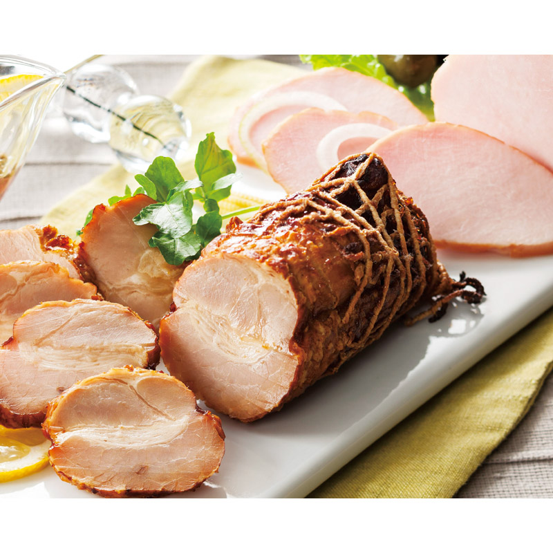 ログイン山桜のチップでスモークした薫り高いロースハムと1本1本ロースターでつるし焼きした自慢の焼豚です。