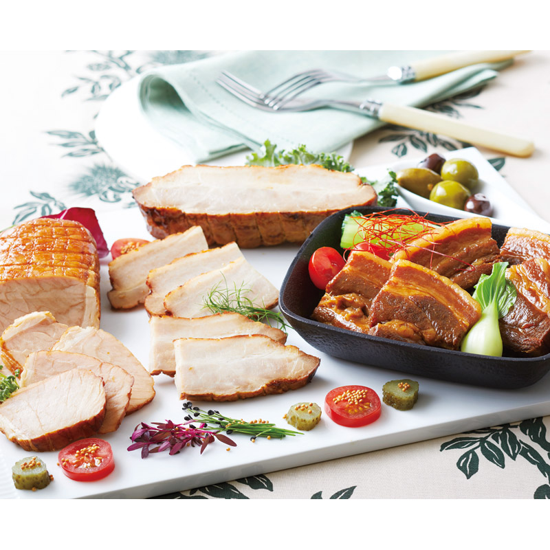 ログインじっくりと焼き上げたつるし焼豚、しっとり柔らかい素材の旨みが堪能できるロース焼豚、箸で切れる程柔らかい豚角煮のセットです。