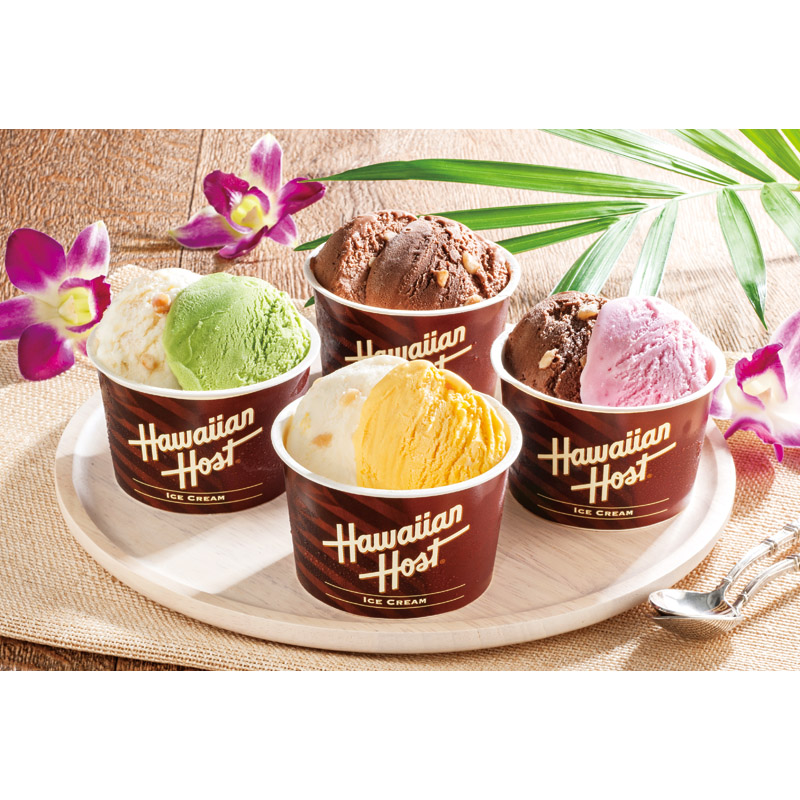 「ハワイアンホースト」の代名詞であるマカダミアナッツのクラッシュを練りこんだミルクチョコアイスと、ミルクとホワイト2種のマカダミアチョコアイスに、相性抜群の3つのフレーバーを組み合わせ、見た目も味も楽しいアイスに仕上げました。