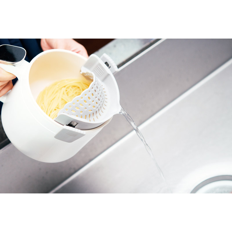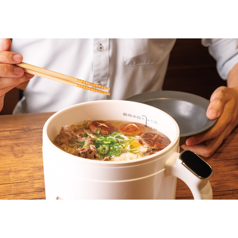 ボタンひとつでピッと簡単、あなただけの調理鍋。多彩な調理メニューを簡単操作、タッチするだけで調理スタート。調理をさらに便利にする蒸し皿・湯切り付。20種類のレシビブック付。