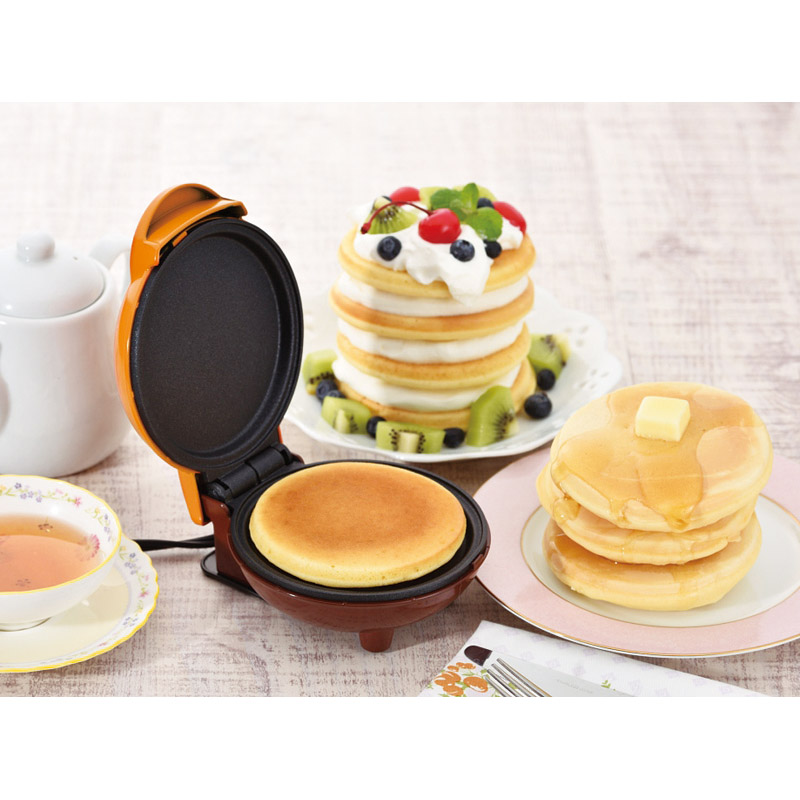 手のひらサイズのパンケーキメーカー。直径10㎝のプチパンケーキが約3分で作れます。プレートはフッ素樹脂塗装でお手入れ簡単。お好み焼きやマドレーヌなども作れるかんたんレシピ付き。