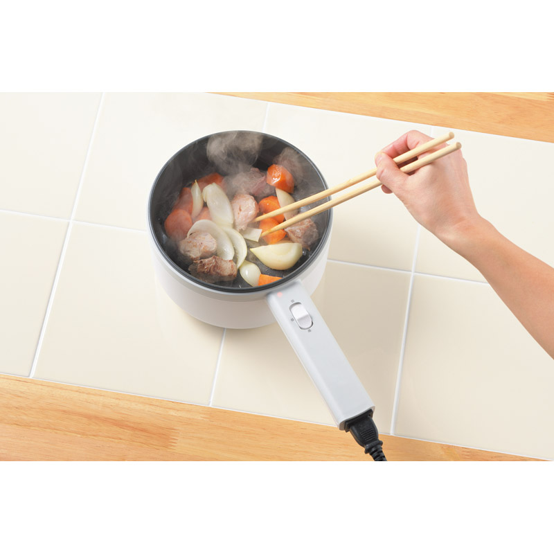 火を使わずに調理ができる片手鍋。蒸し器付きで蒸し料理にも対応。コンセントがあれば、コンロやIHがなくても、ダイニングで、オフィスで煮る・茹でるの調理ができます。鍋はふっ素加工なので簡単お手入れです。