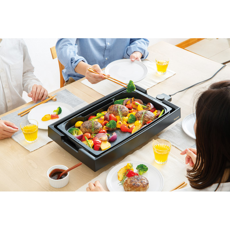 スチームポケットを備えたスチームホットプレートで蒸すと焼くの調理法が可能です。具材をたっぷり入れてもこぼれにくい4㎝の深型プレート。プレートは丸洗いできお手入れ簡単。お好み焼が2枚焼けるワイドサイズ。