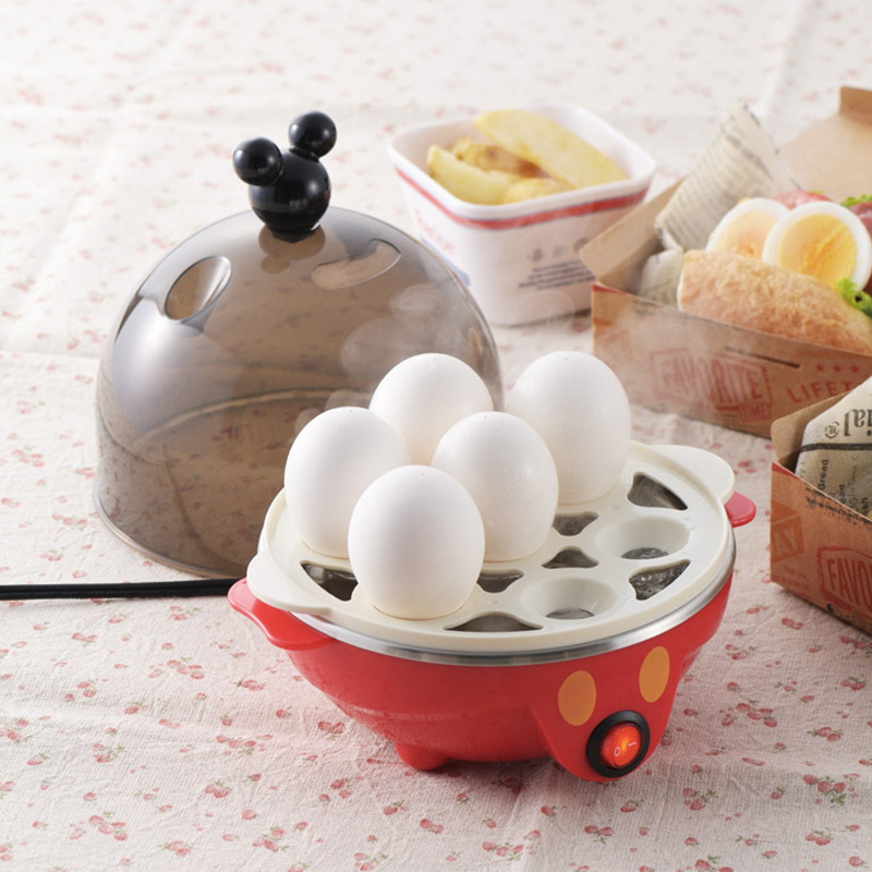 ミッキーマウスモチーフのかわいいゆで卵器です。セットしてスイッチを入れるだけで、簡単にゆで卵が作れます。半熟、完熟、お好みのゆで加減を選ぶことが出来ます。付属の計量カップで必要な水の分量がラクラク測れます。