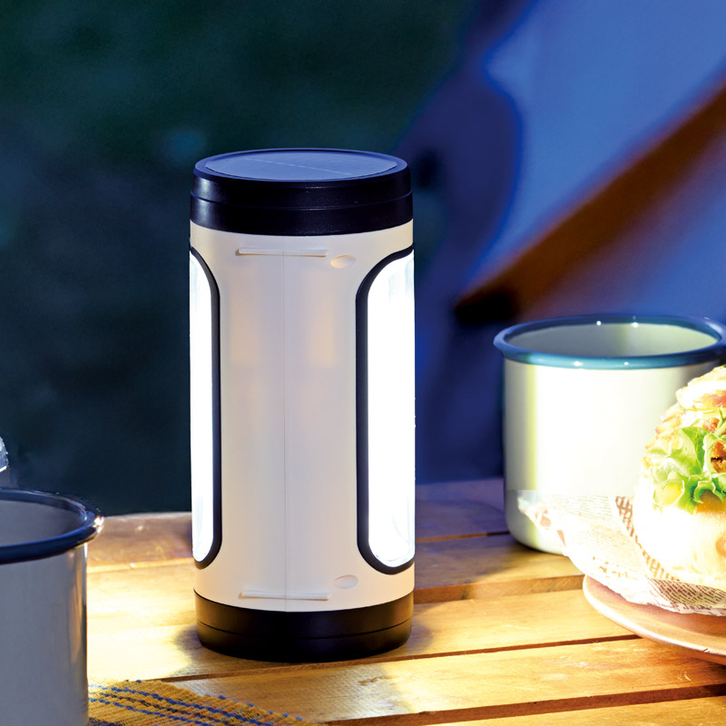 ログイン懐中電灯とランタンの2WAY仕様のライト。USB充電だけでなく、ソーラー充電も可能。USBコード(TYPE-A・TYPE-C)付。