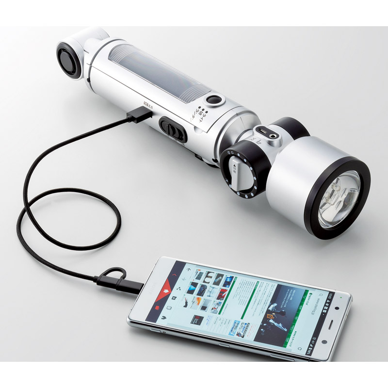 携帯電話の充電が従来のハンドル回転式に代わり、アルカリ乾電池及び蓄電された内部電源から直接ケーブルをつなぐだけで可能となりました。スマートフォン対応。本体へはソーラー、ダイナモハンドルそして外部USBポートから充電が可能です。ショルダーストラップ、防災マニュアル付。●LEDライト3灯、LEDランタン4灯●AM/FMラジオ●サイレン●イヤホンジャック(イヤホン別売)●ダイナモハンドル●太陽電池●USB充電機能●プラグイン携帯充電機能(2in1ケーブル(マイクロUSB/TYPE-C))