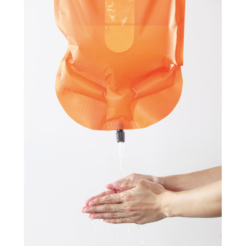 緊急時の簡易洗濯に。洗濯物・水・必要な場合は洗剤を入れて上下にふって汚れを落とします。底についたバルブをゆるめて脱水も可能。アウトドアで手洗いとしても活躍します。