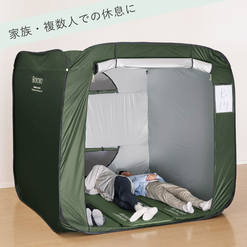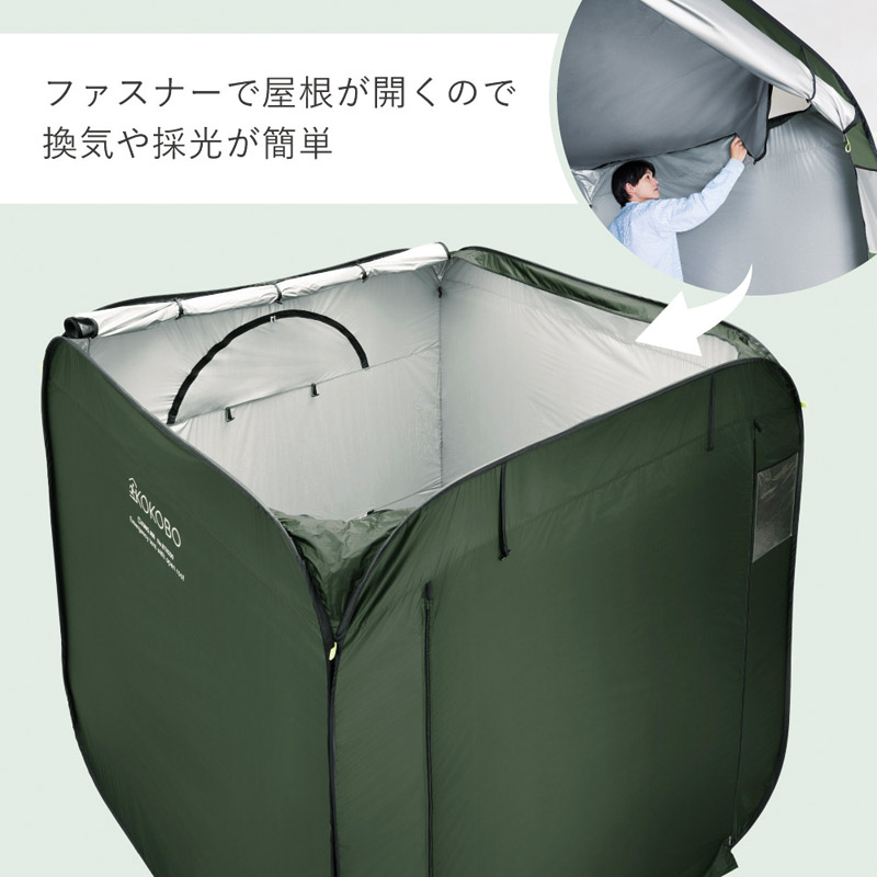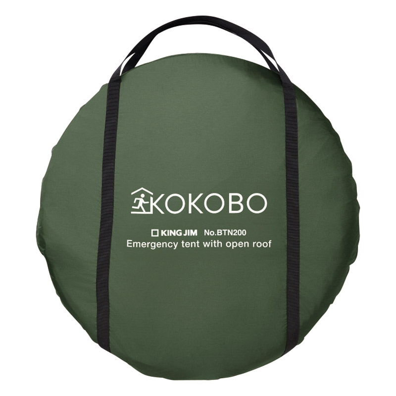ファスナーで屋根が開けられる防災テント。換気も採光も簡単で、大人3人まで入れる広々サイズです。外側にA4クリアポケットが付いているので「更衣室」「トイレ」などの紙を入れて表札代わりに使え、誤った立ち入りを防ぎます。テント外側四隅のタグとファスナーの引手が光るので、停電後や消灯後も安心です。