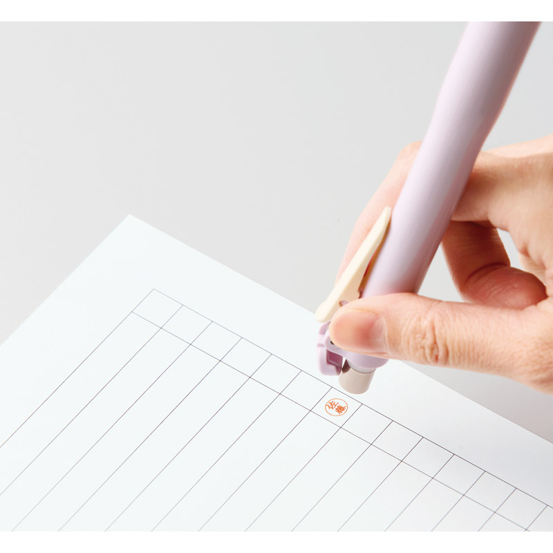 認印(9㎜)と訂正印(6㎜)の2つのネーム印がコンパクトな1本に。キャップが本体と一体化しており、紛失の心配なく使用でき、キャップ開閉やロックが片手でできます。ペン型のロングタイプで、便利なバインダークリップ付きです。