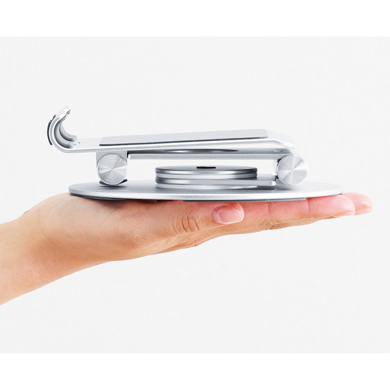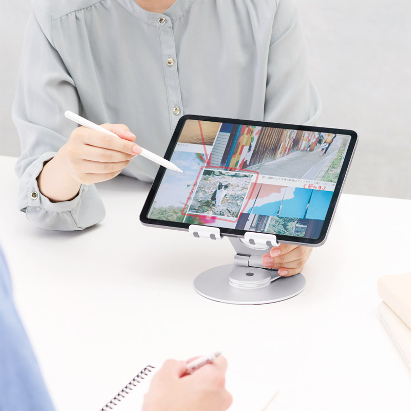 台座は360°回転でき、台座とアーム、アームとスタンド部の二ヶ所の角度を無段階に調整できるので、好みの高さや角度で使用できます。アームを折りたたんでコンパクトに収納できます。○対応サイズ:7~13インチのタブレット・スマートフォン○耐荷重:1㎏
