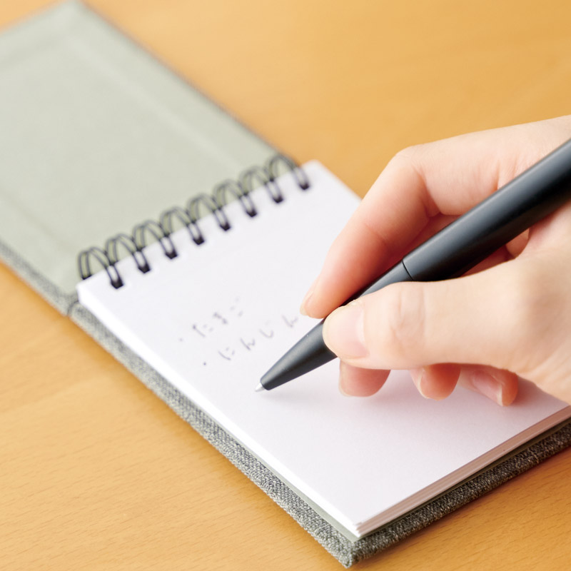 「リサイクルPET」を表紙に、再生紙をメモ用紙に使用。メモサイズ:75×107㎜(50枚)。メモにはミシン目付き。
