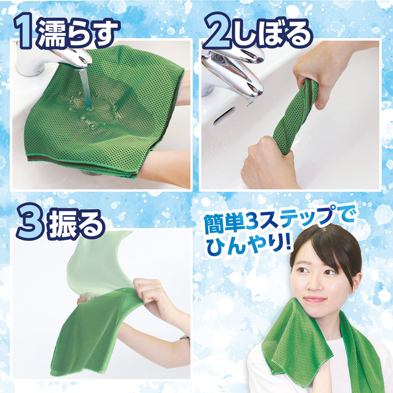 ログイン瞬時に超冷感。水につけて絞って振るだけでひんやりクール。