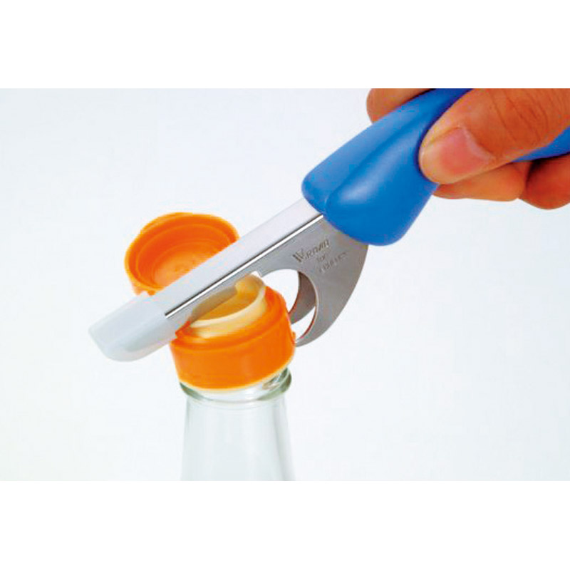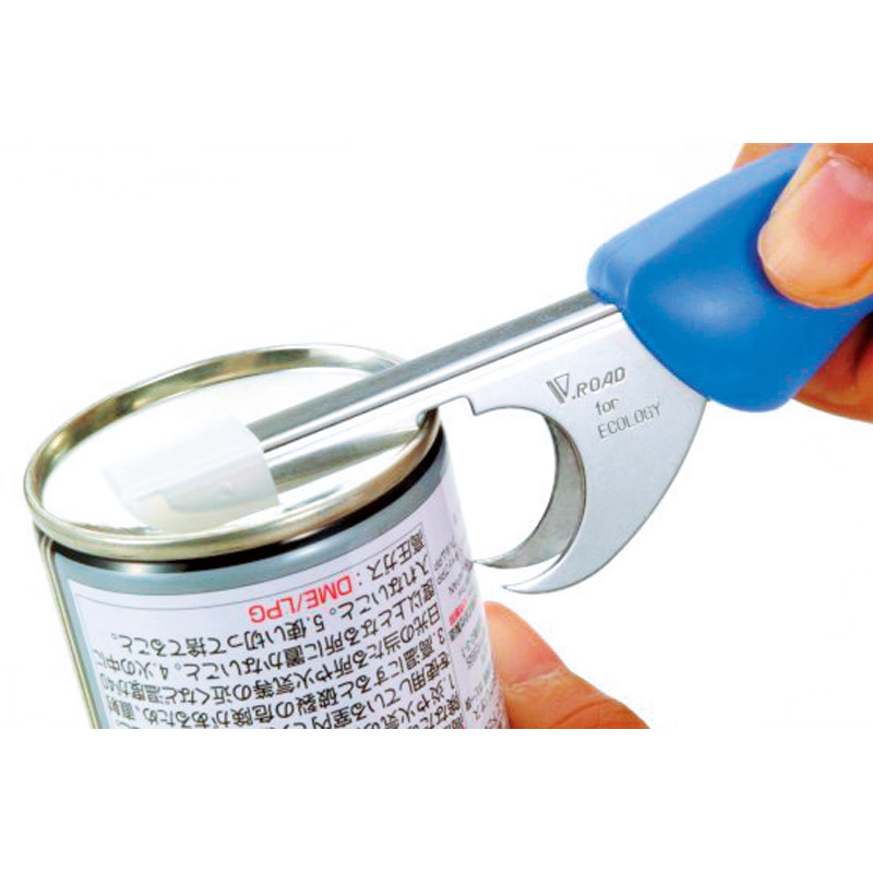 これ1つでビンの樹脂キャップ取り、ビンのラベル剥がし、スプレー缶のガス抜き、PETボトルのフィルム剥がし、PETボトルのリング取りができます。リサイクル効率を上げてゴミの減量効果を高めます。