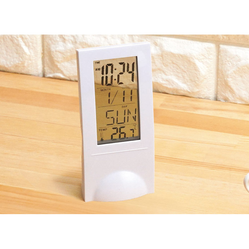 時刻が浮いて見える?ちょっと不思議な置時計。背面のボタンで時間やアラームをセット。お部屋になじむシースルーディスプレー。時刻・日付表示・アラーム・タイマー・温度計。