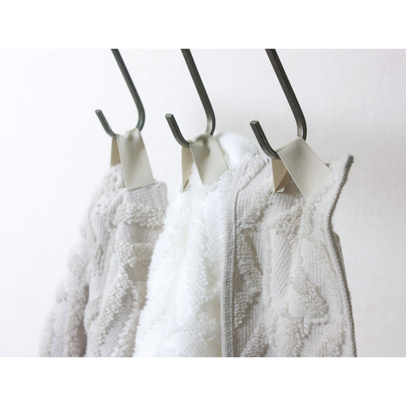 触れた瞬間のやわらかさに驚くソフトな風合いのコンパクトでエコなサイズのフェイスタオル。フックに掛けられるタグ付き。
