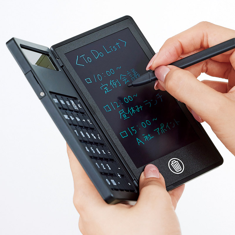 ログイン人気の電子メモに電卓が付いた高機能商品。持ち運び時は液晶部分が内側に折りたたまれるので、画面をキズ付ける心配がございません。