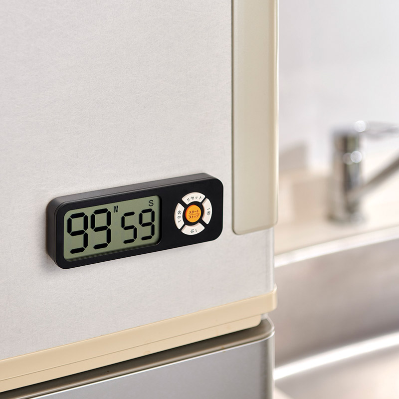 大きな表示ではっきり見やすい。料理や勉強の時にもお使いいただける時計付タイマーです。背面マグネット付。ストップウォッチ機能付。