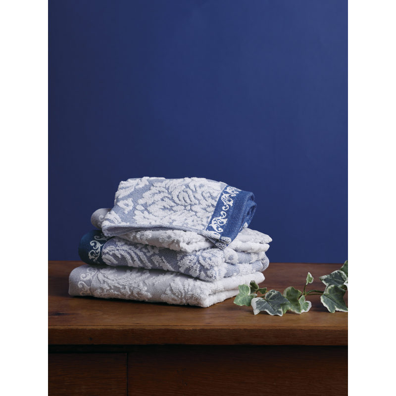 優雅なライフスタイルを演出するタオル ヨーロッパの古い街並みに佇む、歴史ある邸宅の優美な内装や調度品からインスピレーションを受けた、落ち着いたブルーを基調にしたエレガントなデザインは贈り物に最適です。