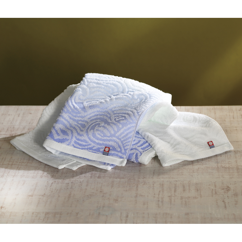 寄せては返す波のように、永遠への願いを込めて。 透き通るような青のグラデーションと白のコントラスト、打ち寄せる白波のように織られた波の模様が印象的。綿の柔らかさを生かしつつ、軽くさっぱりとした肌触りに織り上げられています。