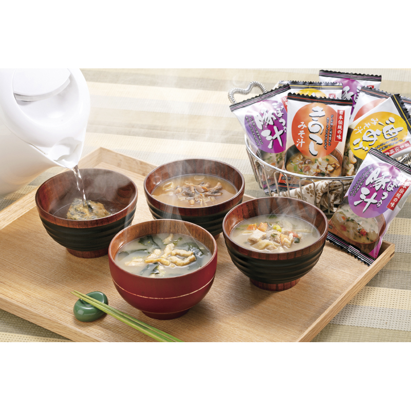 凍結乾燥の技術でお湯を注ぐだけでおいしさそのままのお味噌汁詰合せ。油あげとわかめを使い、和風だしを効かせた定番の油あげ味噌汁。3種のきのこを使い、米みそと豆みそをブレンドした風味豊かなきのこ味噌汁。豚肉と野菜の旨味にごぼうの食感がマッチした、コク深い味わいの豚汁。お味噌汁7種の味詰合せです。