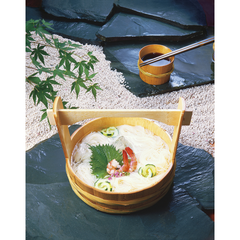良質の小麦粉・播磨地方のおいしい水・赤穂の塩を使い伝統の製法で作り上げたそうめんと醤油のコクと旨味を生かしかつおと昆布の風味を大切にしたバランスの良いつゆのセットです。