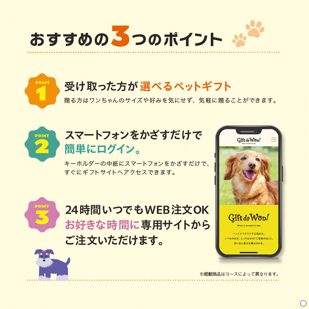 ギフトを受け取った方は、ギフトキーホルダーに付属するコードを読み込むと、専用サイトにアクセスし、ワンちゃんにぴったりなギフトを選ぶことができます。商品お申し込み後、キーホルダーはワンちゃんの写真などを入れて再利用できます。