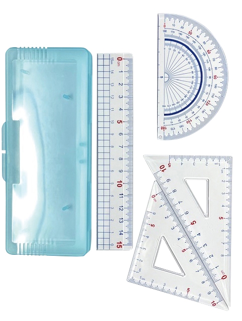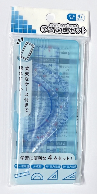 15センチ定規、分度器、直角二等辺三角形、直角三角形の4種類が入っております。メモリの数字が大きいのでとても見やすく測りやすくなっております。