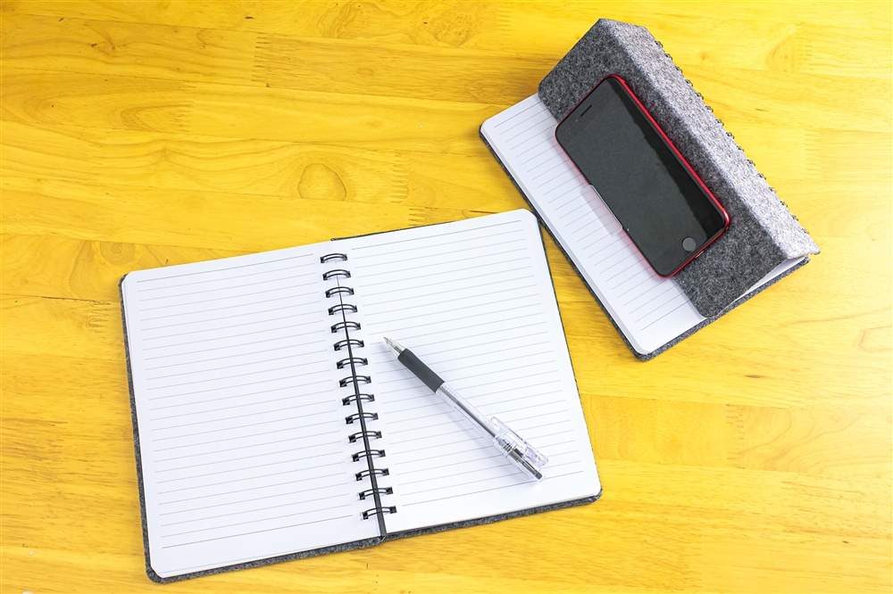 スマホスタンドにもなる、再生紙を使用したエコなノート。 使いやすいA5サイズ。