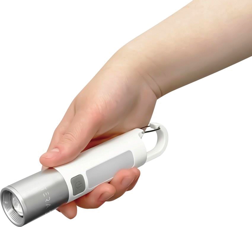 先端スリーブをスライドさせることで照光範囲を調節可能。懐中電灯としても使用できます。カラビナ付きでアウトドアにも便利です。
