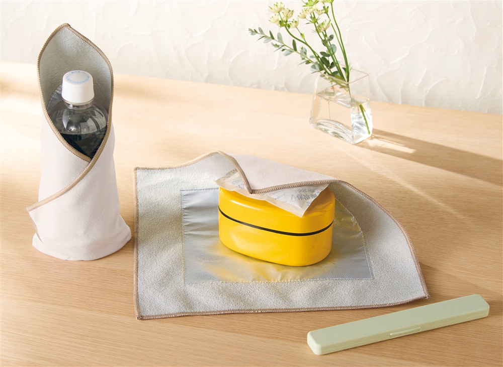 内側にアルミ蒸着フィルム付きで、お弁当やペットボトルの持ち運びにぴったりです。結ばずに留められるので、かさばらず見た目もスマート。