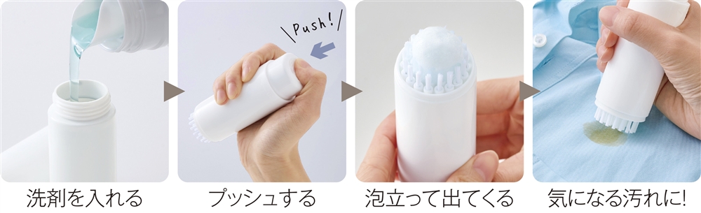 本体の中に液体洗剤を入れてプッシュすると、ブラシ部分から洗剤が泡立って出てくるのでそのまま汚れてしまった部分をこすり洗い!旅行や出張の際にあると心強い1本です。小さいお子さまがいるご家庭向けにも。