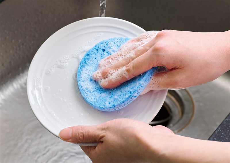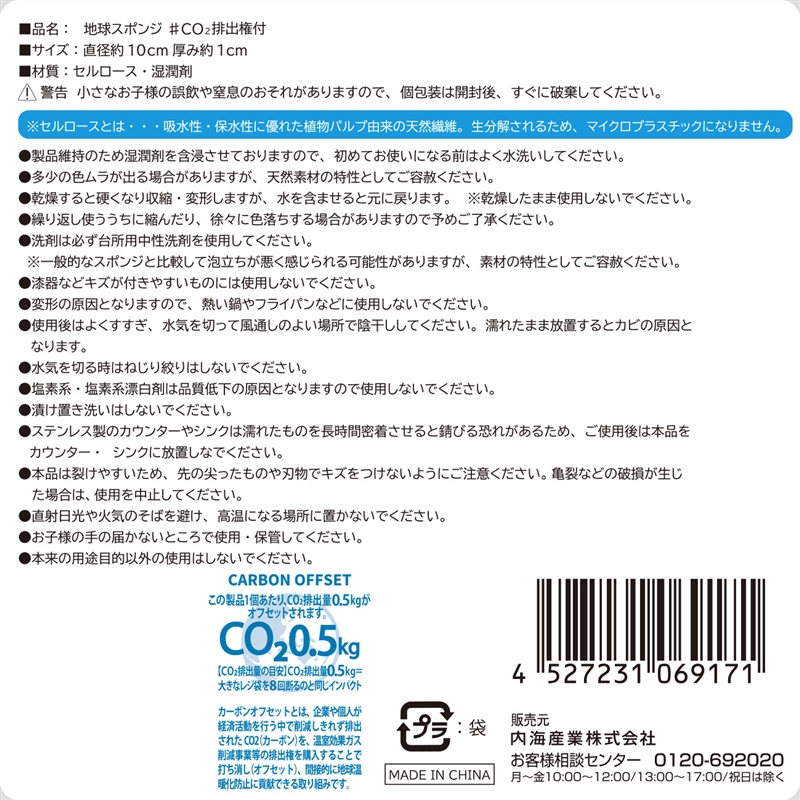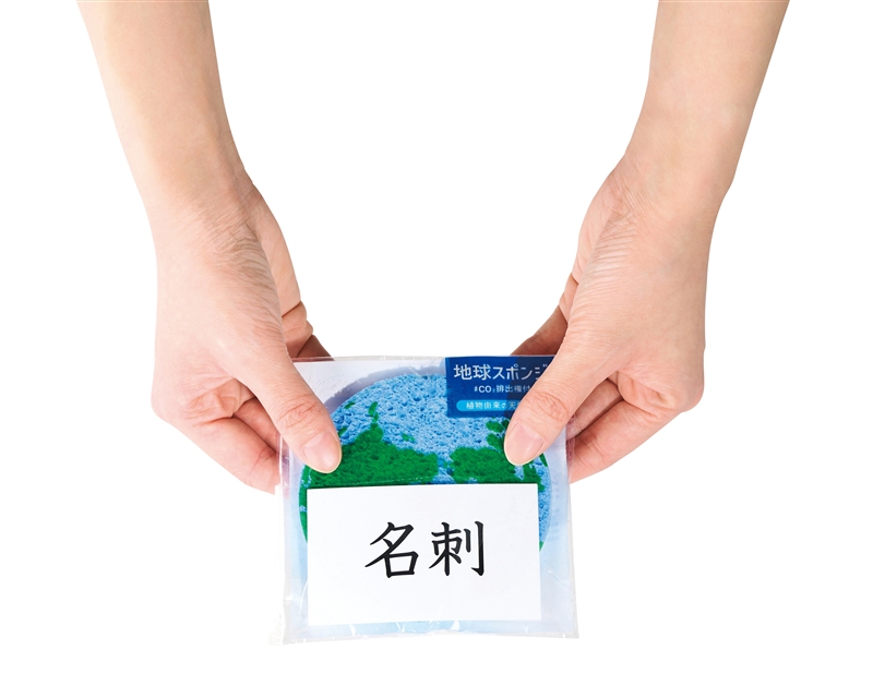 水の星・地球をイメージした名刺ポケット付きのデザインパッケージを使用した環境配慮スポンジ。