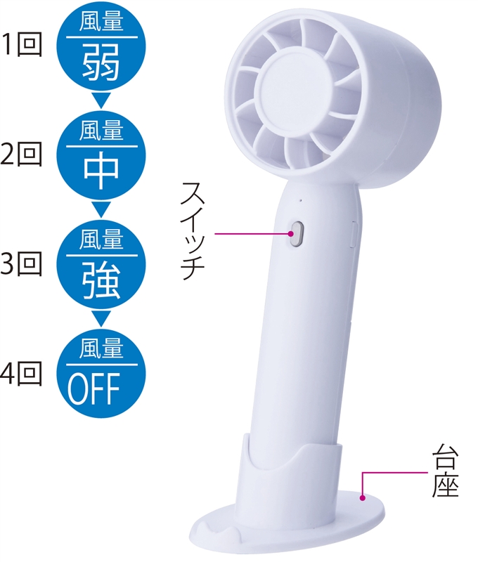 スマホスタンドにもなる台座が付いているので動画視聴や・勉強時間にも重宝します。ヘッド部分が小さめでスマートなので、バッグなどに入れて持ち歩くのにも便利です。風量は弱・中・強の3段調節ができます。