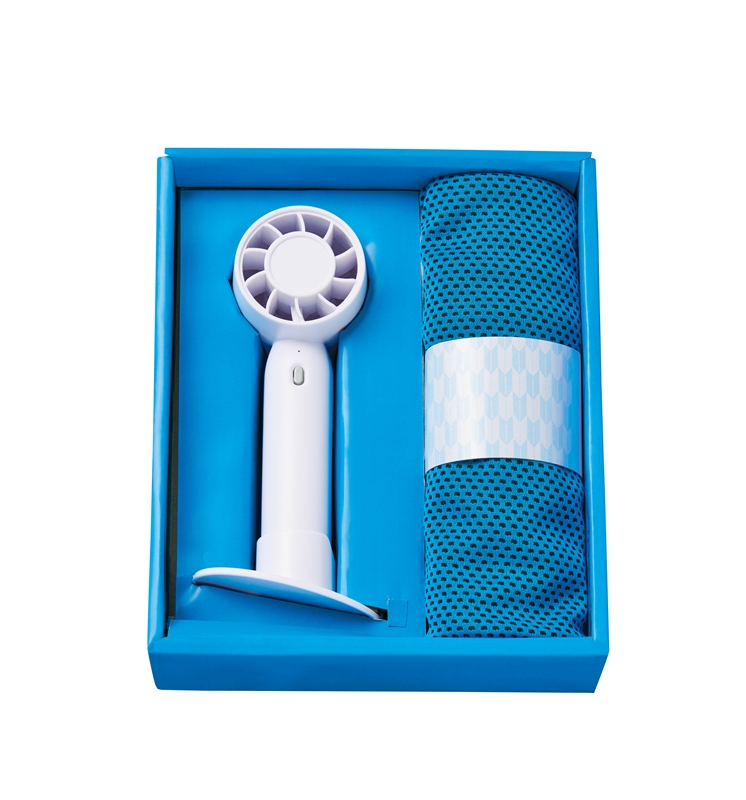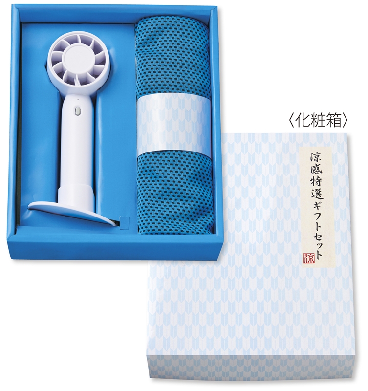 ミニファンとクールタオルを、ギフト感たっぷりの見蓋式化粧箱にセットしました。