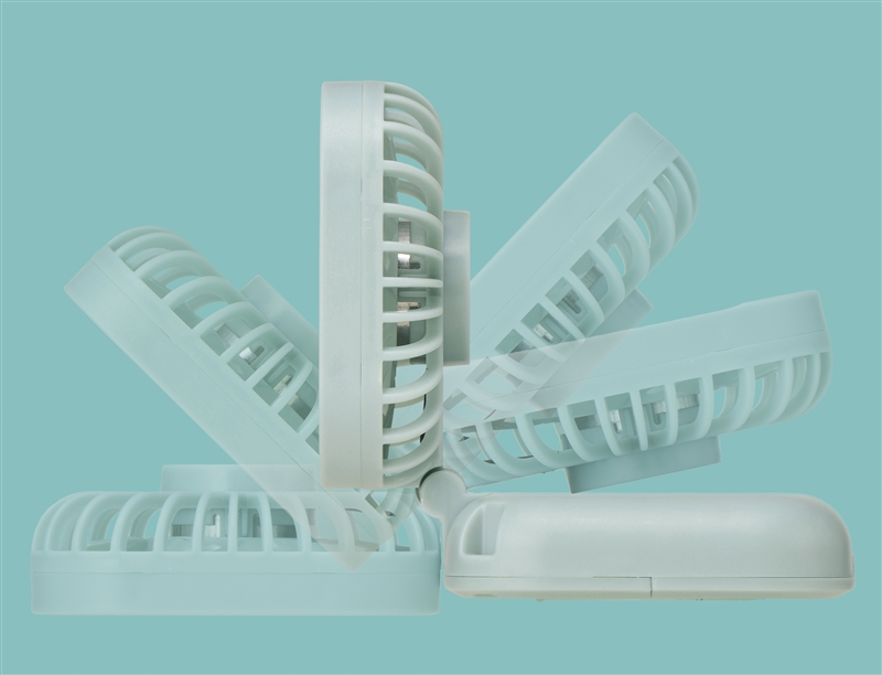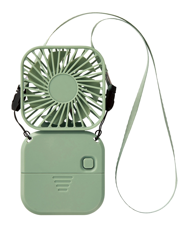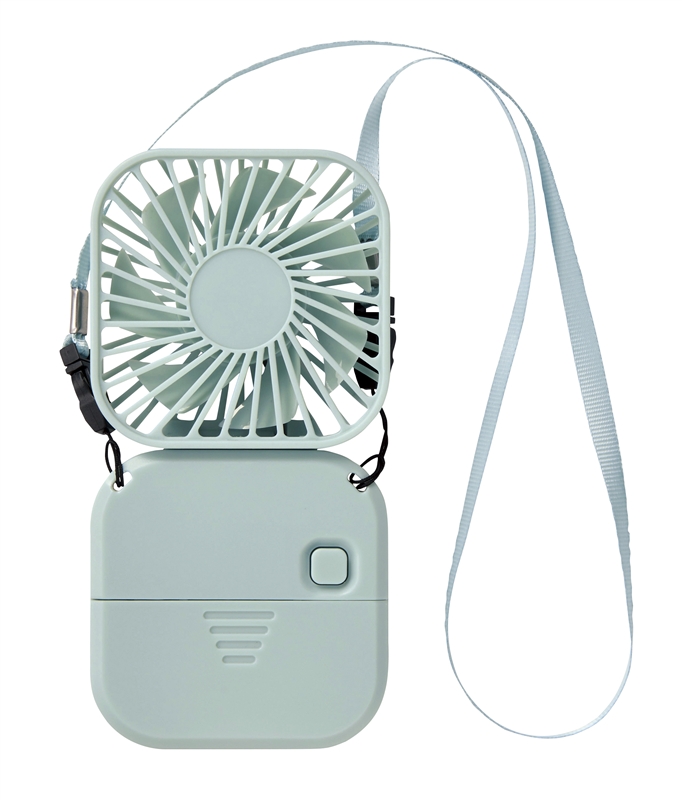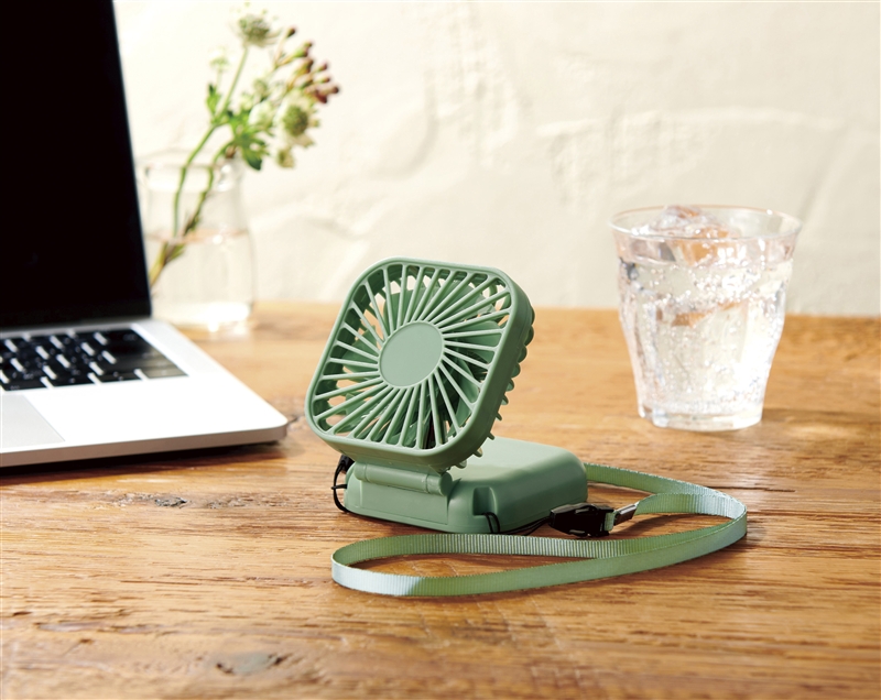 首掛け/手持ち/卓上置きで使えるコンパクトなハンディファン。持ちやすく、安定して置けるスクエア型。