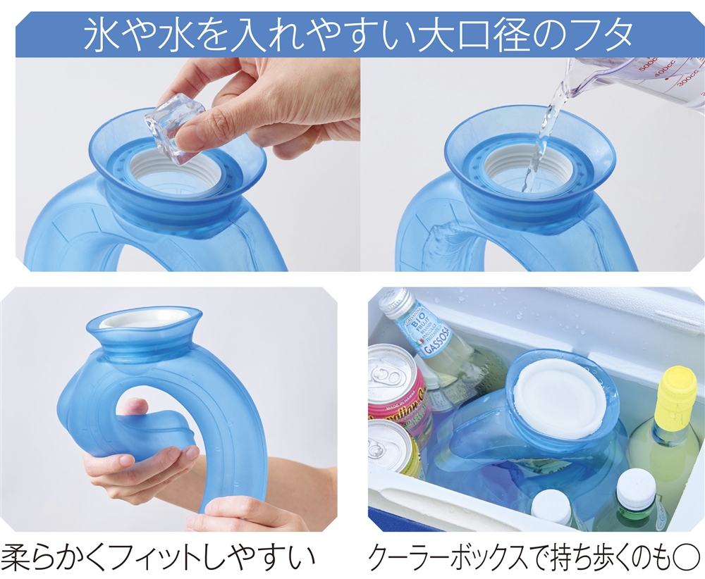 ブロック氷も入れやすい広口タイプ。本体もPVC製なので硬すぎず適度に体にフィットします。スポーツを頑張る人やそれを応援する人、野外レジャーや音楽フェス、農作業などさまざまなシーンで活躍します。持ち運びはクーラーボックスがおすすめです。