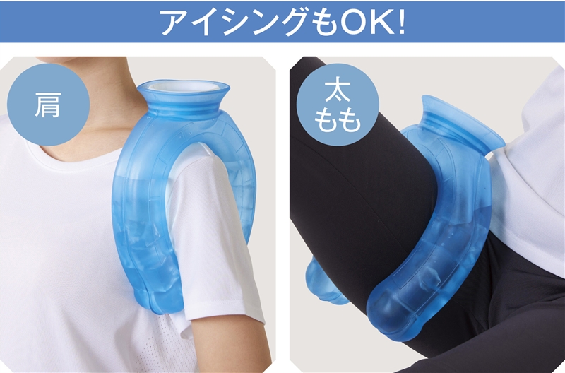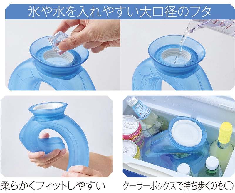 広口タイプなのでブロック氷も入れやすく、使いやすさ抜群。暑い季節の熱中対策はもちろん、スポーツ後のアイシングなどにおすすめ。柔らかい素材で体にやさしくフィットし、首だけでなく肩や足などのクールダウンにも使用可能。スポーツ観戦、野外レジャーや音楽フェス、農作業などさまざまな場面で活躍します。