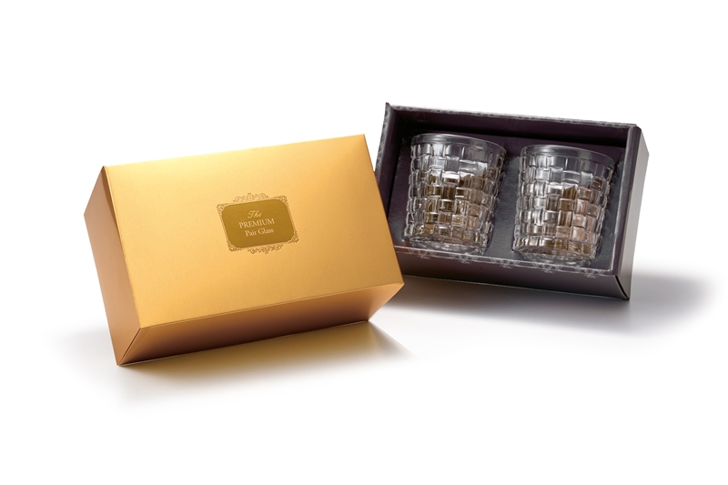 ウイスキーの琥珀色が美しく映えるロックグラスのペアセット。ゴールドボックス入りで、大人の贈り物に。