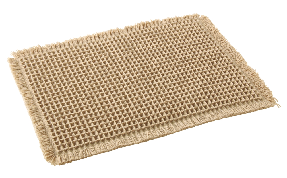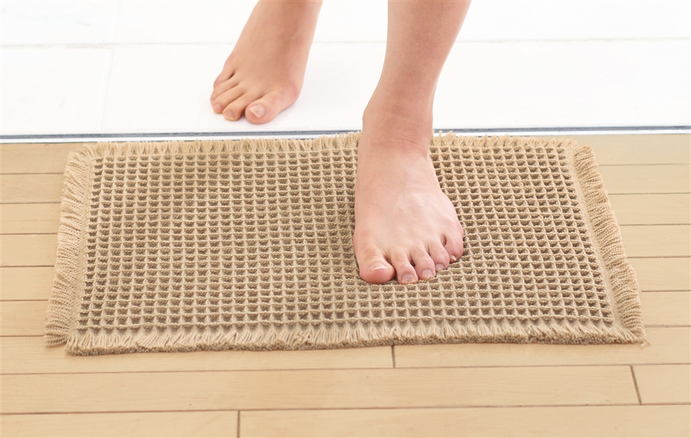 ワッフル織り特有の凹凸が水分をすばやく吸収し、濡れても乾きやすいバスマットです