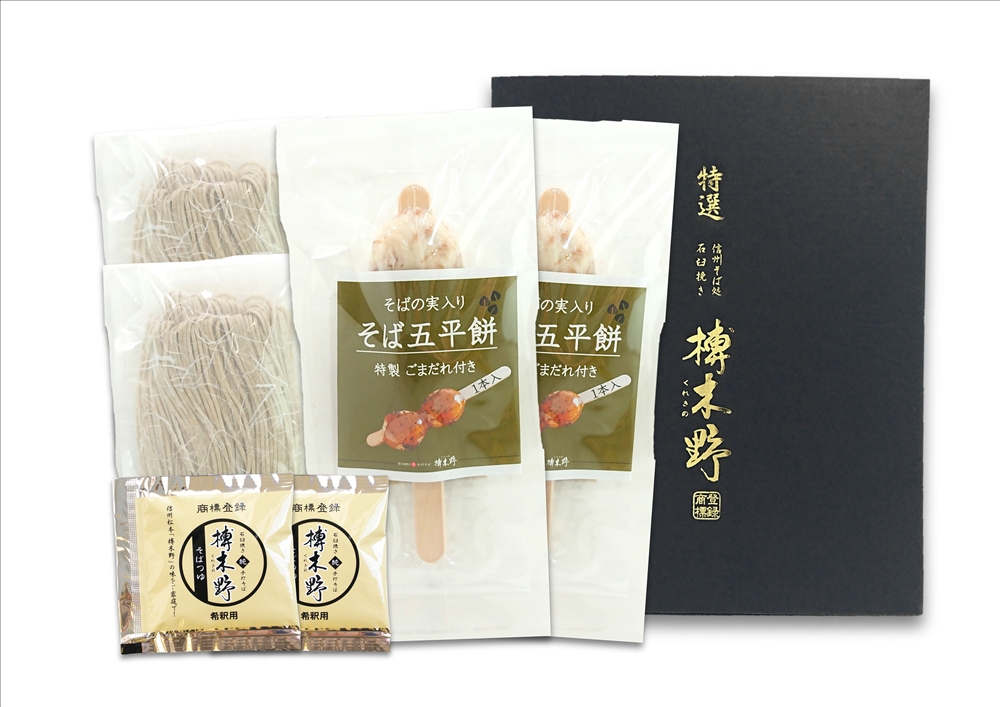 信州蕎麦処「榑木野」監修。信州産石臼挽そば粉使用の半生そばはオリジナルつゆと信州名物八幡屋磯五郎の七味と刻みのり付きです。信州の郷土料理である五平餅は国産のそばの実を練り込んだ唯一無二のもので、電子レンジで簡単調理も可能です。オリジナルのタレ付です。